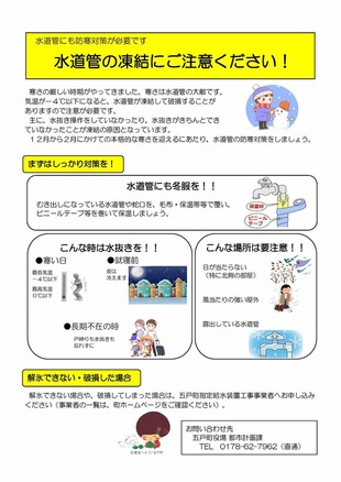 12月から2月にかけ本格的な寒さを迎えるにあたり水道管の防寒対策をしましょう。